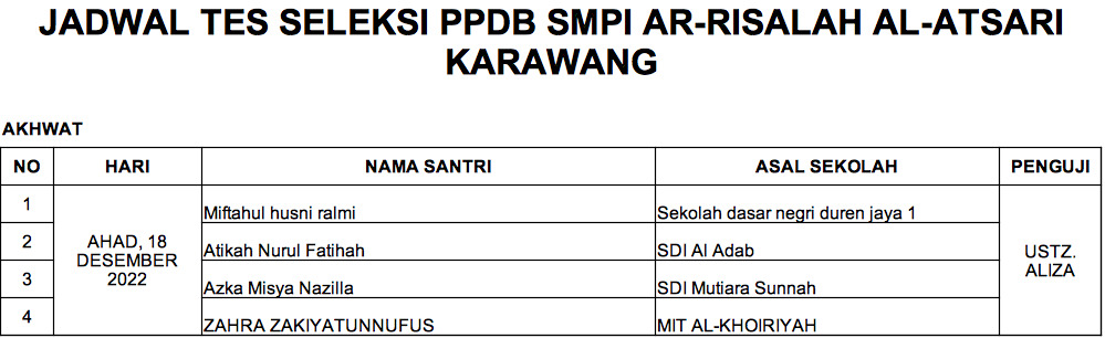 Tes Masuk PPDB Gelombang 1 TMQ (SLTA) ARRISALAH ALATSARI